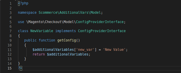 After this, we will create NewVariables.php in Scommerce/AdditionalVars/Model folder and add the following code to it –