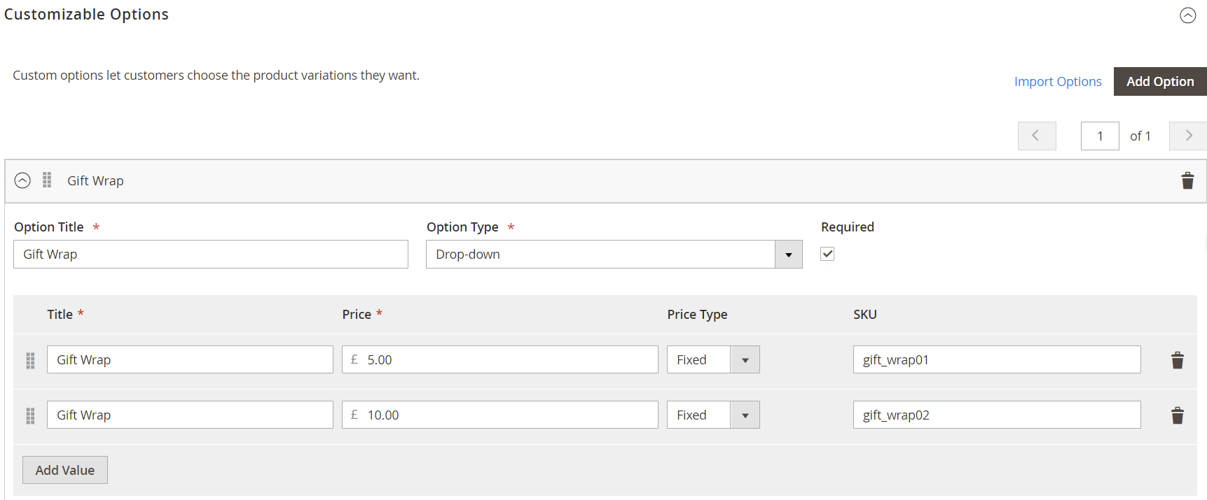 As the name suggests custom options are somewhat of an extra service offered with products at a certain price. For instance, some stores offer the custom option “Gift Wrap” with products. It adds extra value to products and increases the chances of conversion. Similarly depending upon the niche of your store several custom options can be offered with products. Some other examples can be personalization, engraving, etc.