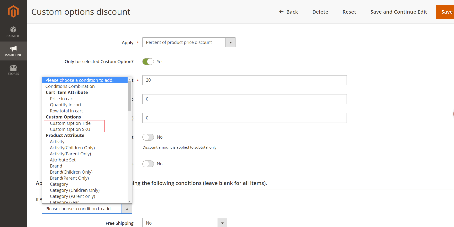 - Use the Custom Option Title or Custom Option SKU to specify which product or custom option the discount applies to.