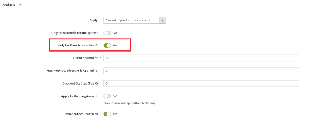 In the above setup we applied discounts to the final price of the product, which includes the base price and the price of any selected custom options. Unfortunately, this approach does not allow for discounts to apply exclusively to the base price, leaving the prices of custom options unaffected.