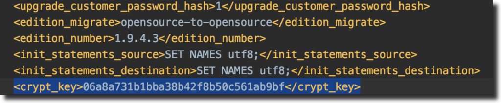 - In the same config.xml, look for crypt_key under options add crypt_key from Magento 1 which can be found under app/etc/local.xml in your Magento 1 instance. After adding it should look like the below image:-