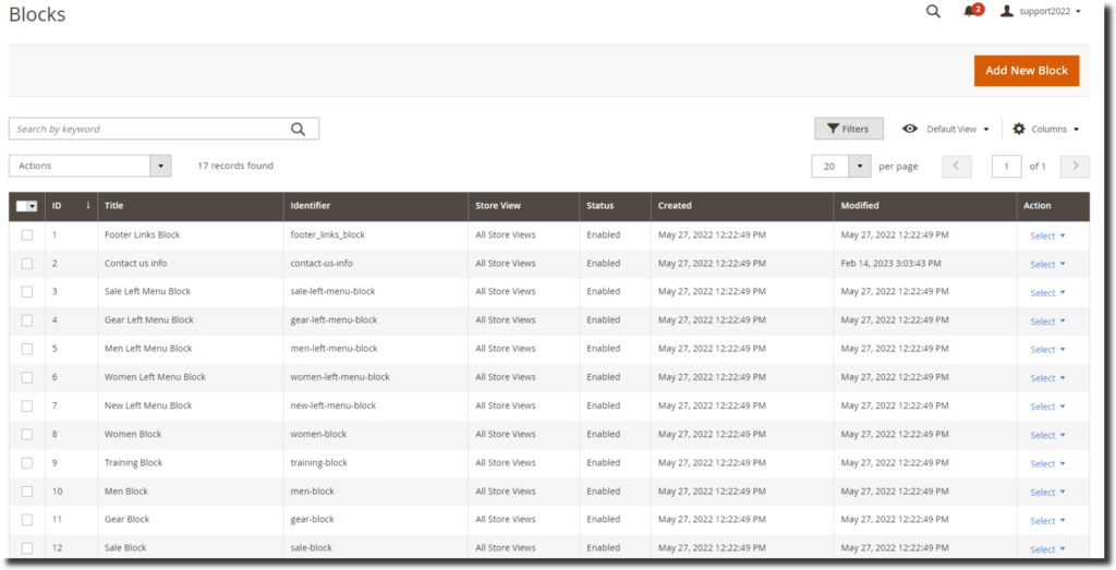Step 1:- Navigate to Admin>Content>Blocks and then edit the block where you wish to add the Magento 2 Product Reviews slider. We will add the slider on the Home Page block.