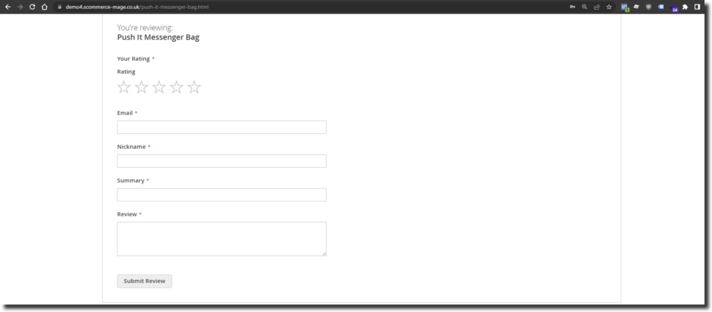 The Magento 2 product reviews extension also adds an email field in the default product reviews for which was not available previously. This helps you capture emails alongwith the reviews posted by customers. You can choose to enable or disable this field directly from the configuration by going into Admin>Stores>Configuration>Scommerce Configuration>Product Reviews and set ‘Email Field Enabled’ to ‘Yes’ or ‘No’ to disable it. Once enabled the email field can be seen on the form as shown below:-