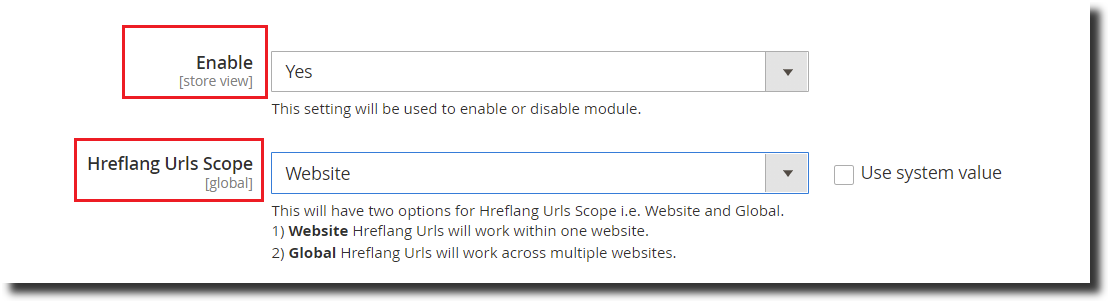 Step 2:- Enable the extension and in the Hreflang URLs scope select “Global” if you want it to be on multi websites or select “Website” to implement it on a single website.
