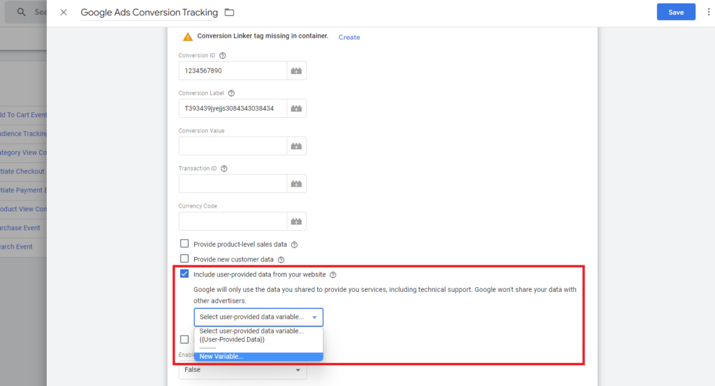 Next, check the ‘Include user-provided data from your website’ and select our newly created variable ‘User Provided Data’ from the dropdown.