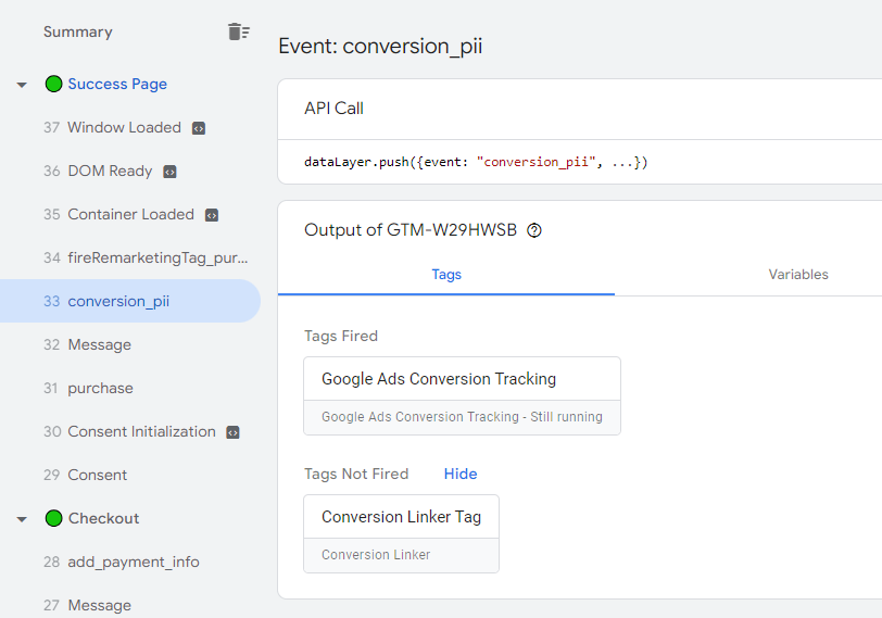 Now our GTM setup is ready, we can do a test purchase to make sure all the data is getting populated as well as our tag is firing correctly using the GTM preview mode. We can see in the below screenshot that our Google Ads Enhanced Conversion setup is working correctly.