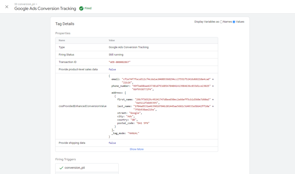 In the configuration if you have selected “Send Conversion Data using data layer” as “Yes” then the PII data can be seen in the data layer which looks similar as below :-
