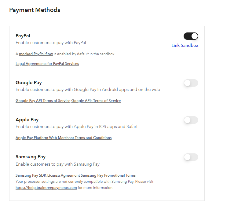 Note:- Enabling Paypal through Braintree requires linking both Braintree and sandbox Paypal accounts which can be done by going to the Braintree configuration as explained above.