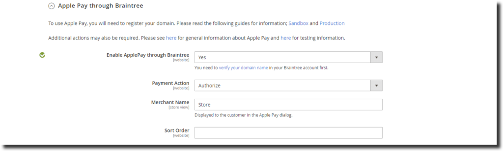 If you want to offer Apple Pay as a payment option with Braintree in Magento 2, you need to enable it in the basic settings as mentioned above. Then, you need to configure some additional options for Apple Pay in the Apple Pay through Braintree Settings section. You need to enter the following information: