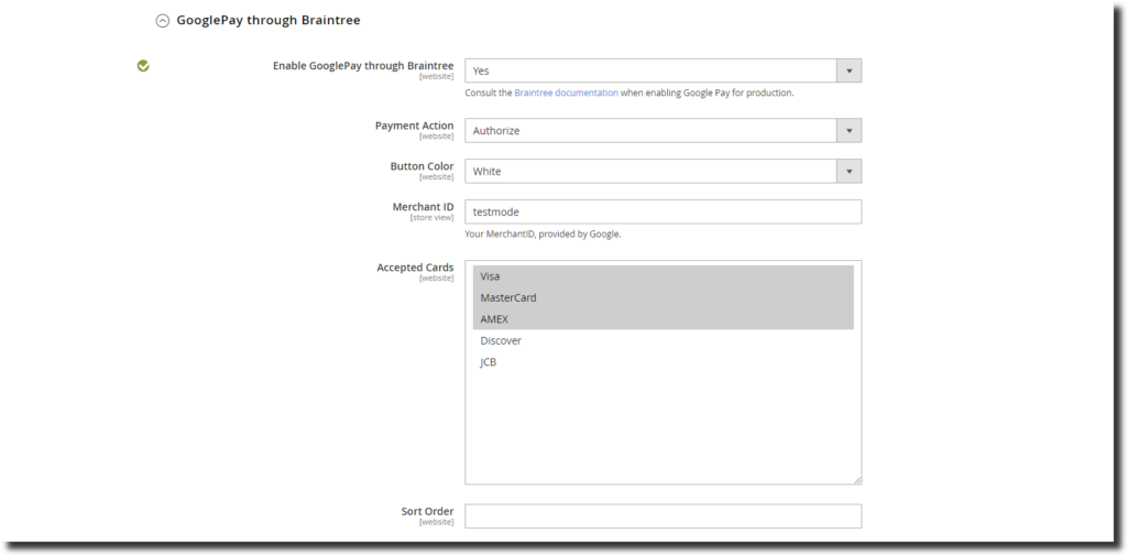 - Accepted Cards: This is the list of card types that you want to accept with Google Pay through Braintree. You can select one or more of the following options: Visa, Mastercard, American Express, Discover, JCB, Diners Club.
