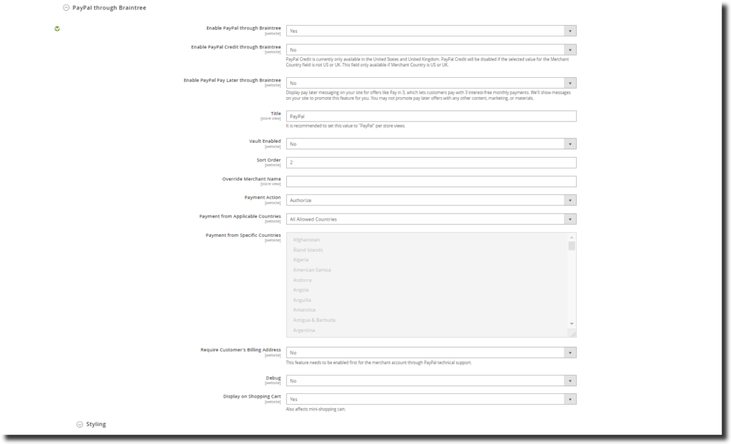 - Payment from Applicable Countries: Determines if you accept payments processed by PayPal through Braintree from all countries, or only specific countries.
