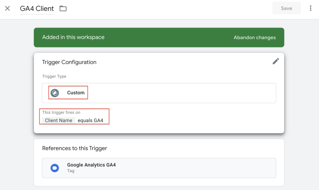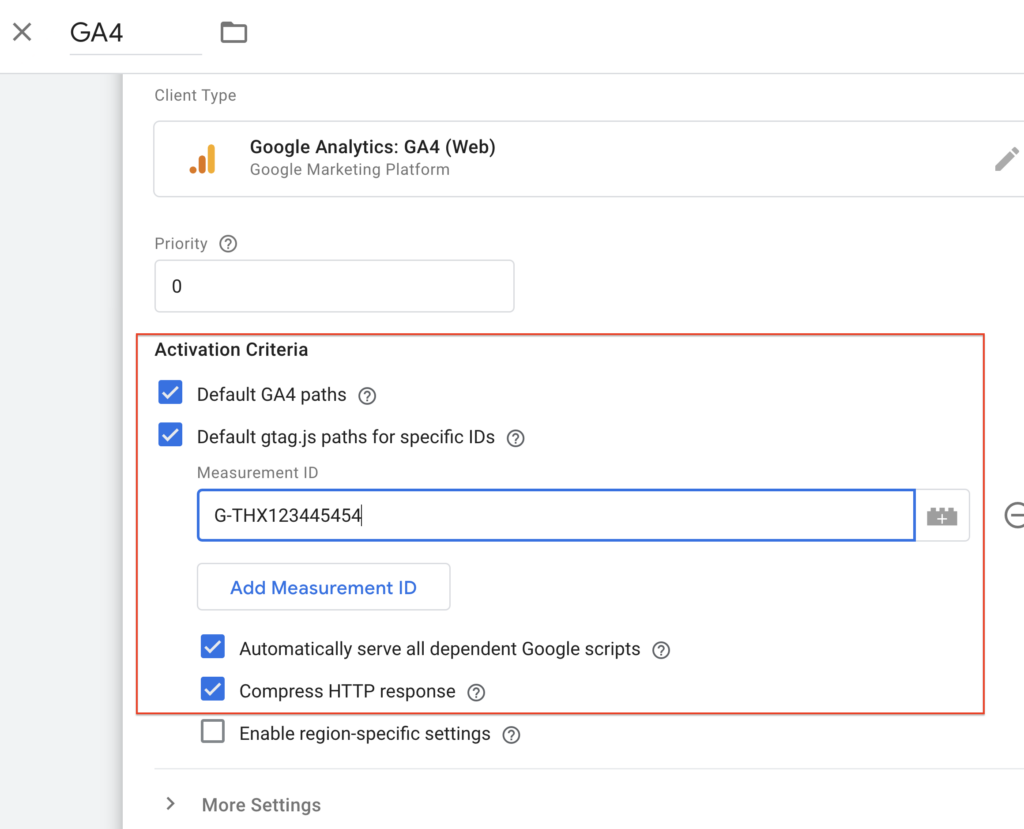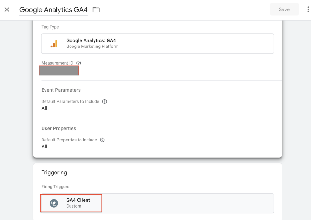 Once tag created add measurement ID of your GA4 property and add trigger “GA4 client” which you created in previous step.
