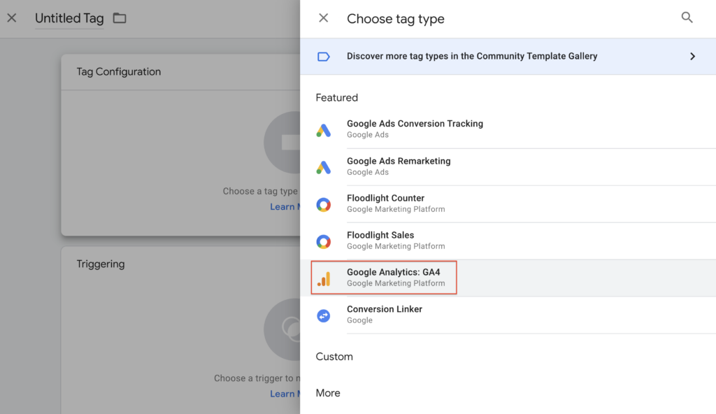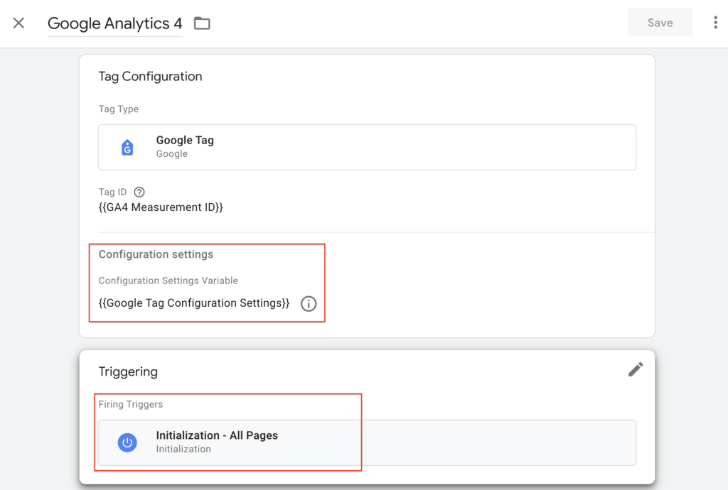 - To ensure that the Google tag fires before other triggers, click Triggering and use the Initialization – All pages trigger.