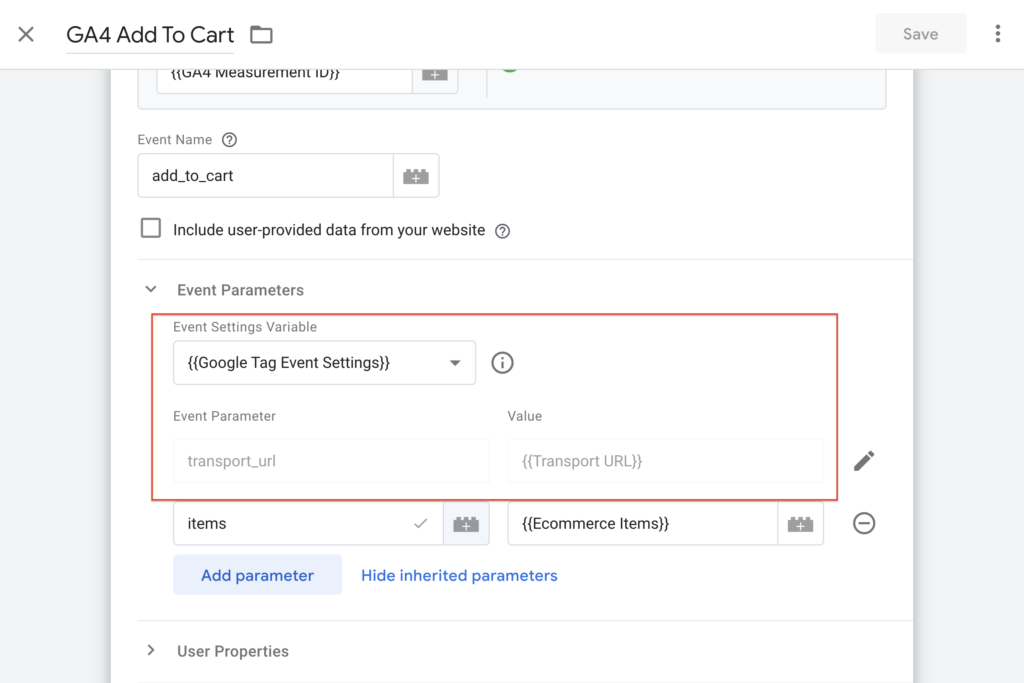 - Create a New user-defined variable of the type Google tag: Configuration settings.