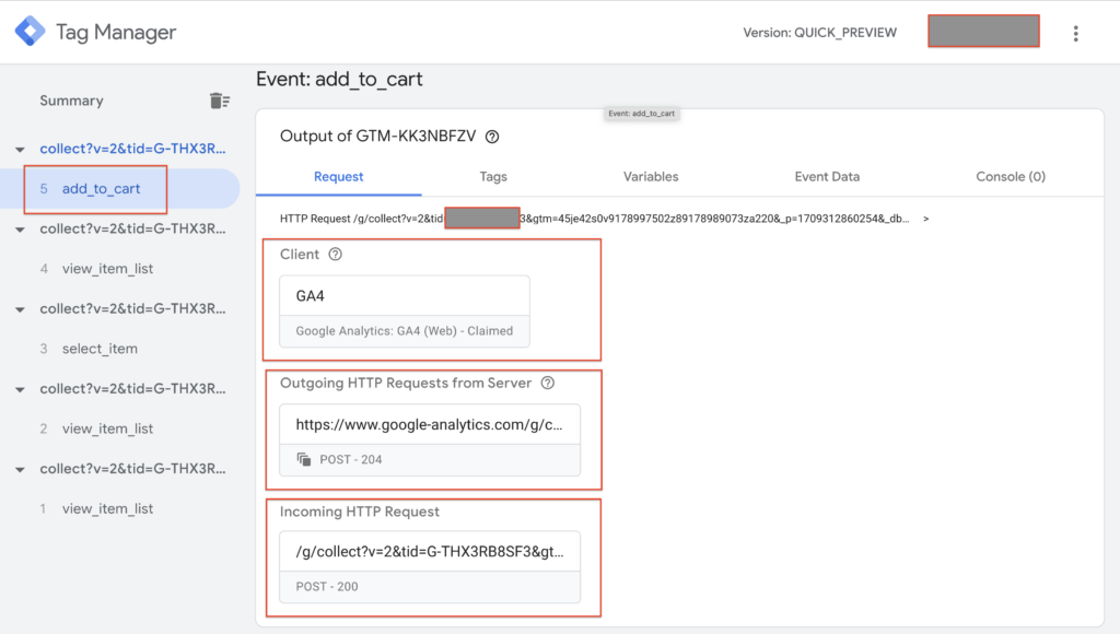 Turn on preview mode for both your web and server GTM containers. You will see how your web container sends GA4 client requests to your server container, which then forwards them to GA4.