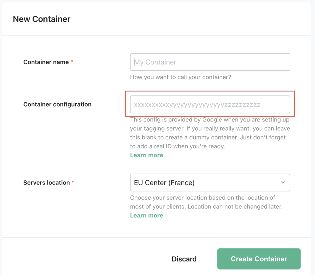 You will receive a URL at the end whether you choose Google Cloud Platform or Stape.io. Both options also require you to provide the container config ID as shown below.