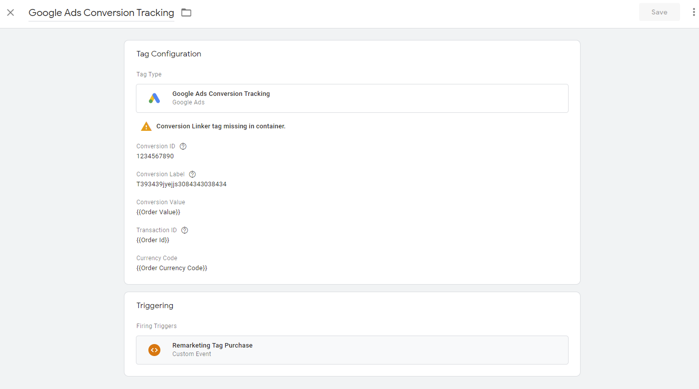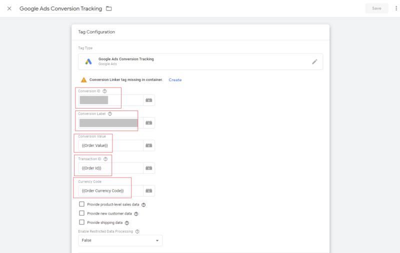 Step 4:- Enter the Conversion ID and Conversion Label. In Conversion Value enter {{Order Value}}, in Transaction ID enter {{Order ID}}, and in currency code enter {{Order Currency Code}}. These are the variables that we created previously.