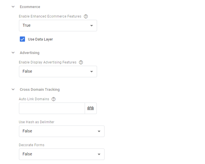 Step 5:- Scroll down below and expand Ecommerce then set Enable Enhanced Ecommerce Features to “True” and tick the Use Data Layer. This setting will automatically pickup pageviews from the data layer. Go to Advertising and set it to “False” then click on Cross Domain Tracking and set Use Hash as Delimiter & Decorate Forms to “False”