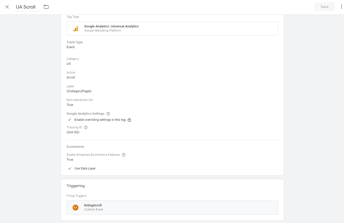 This Trigger Fires on:- Some Custom Events :- Event Equals listingScroll