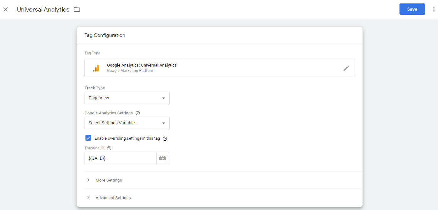 You need to create a Universal Analytics tag and provide the Google Analytics ID to connect GTM with Google Analytics. We will store the Google Analytics ID in a variable so let us create this variable.