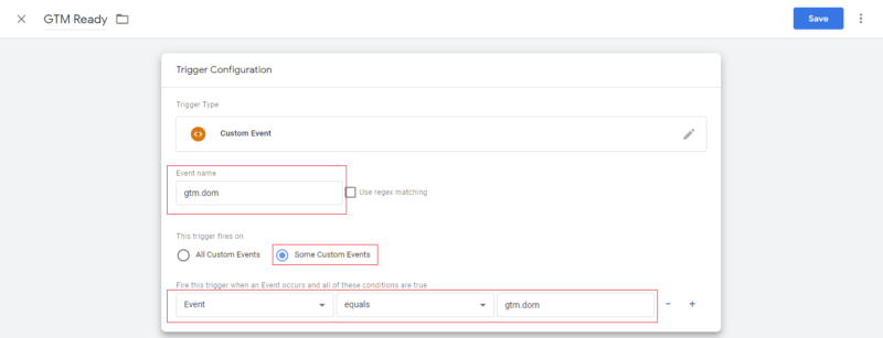 Step 3:- Enter Event Name as “gtm.dom” and select “Some Custom Events” in This trigger fires on and enter Event Equals gtm.dom in the below input boxes. Refer to the image below:-