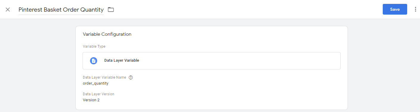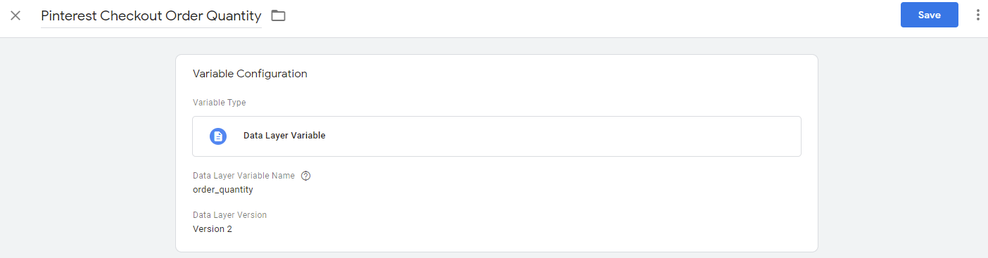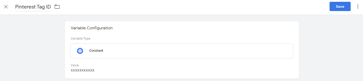 Step 4:- In the Value input box enter your Pinterest Tag ID and click on Save to save your newly created variable.