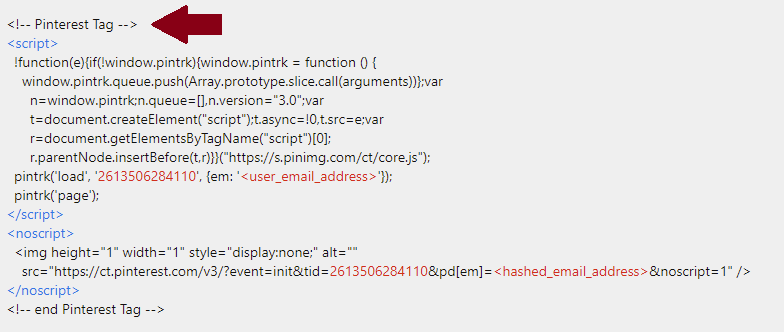 The base tag of Pinterest tracking is given below. It needs to be added to every page of your store.