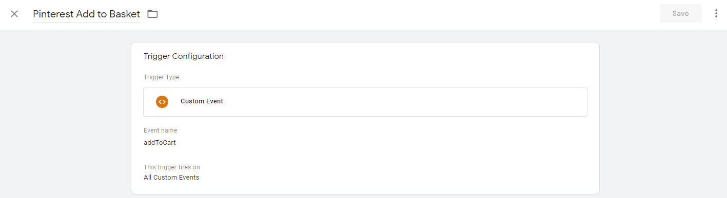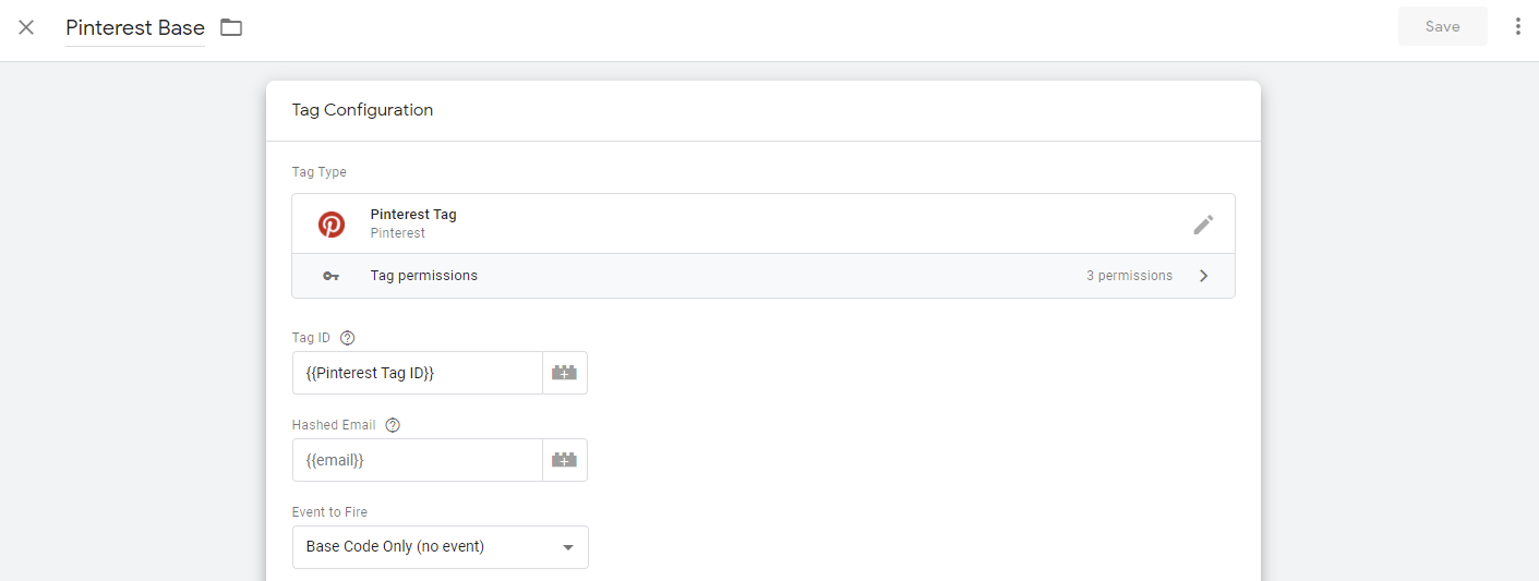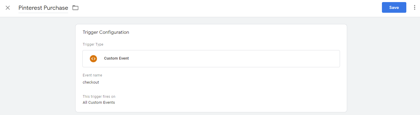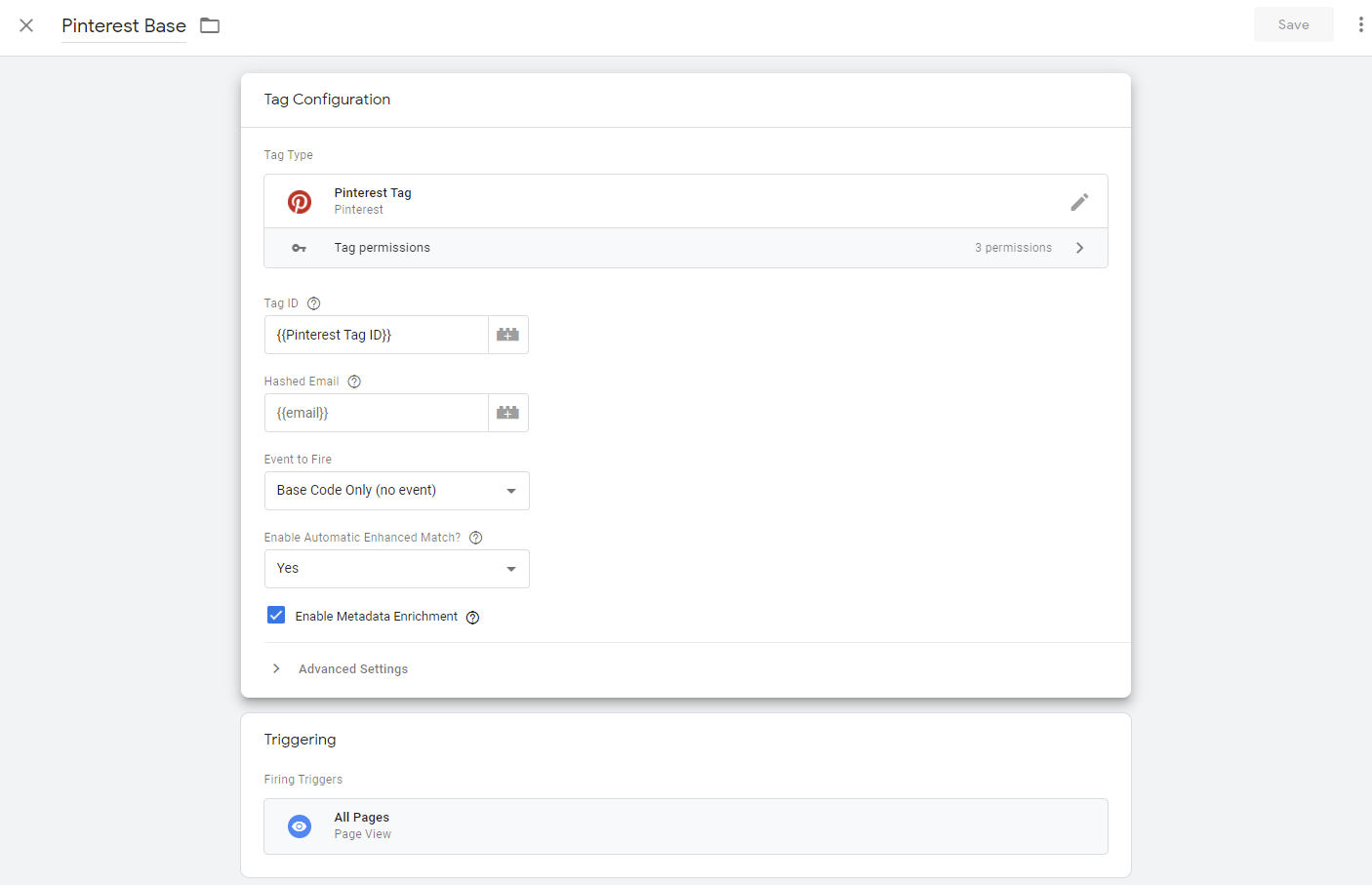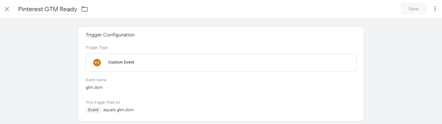 Triggering:- Select the Pinterest GTM Ready trigger that we created in the previous step.