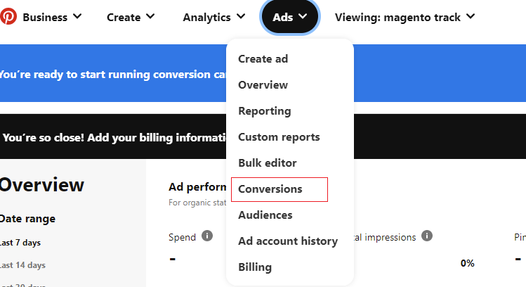 Step 3:- Once created visit Pinterest ads. Then click on Ads>Conversions.