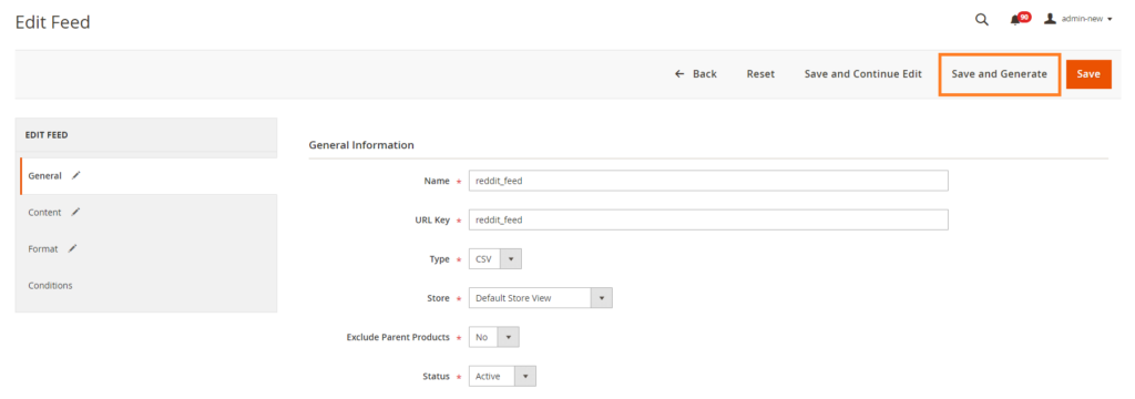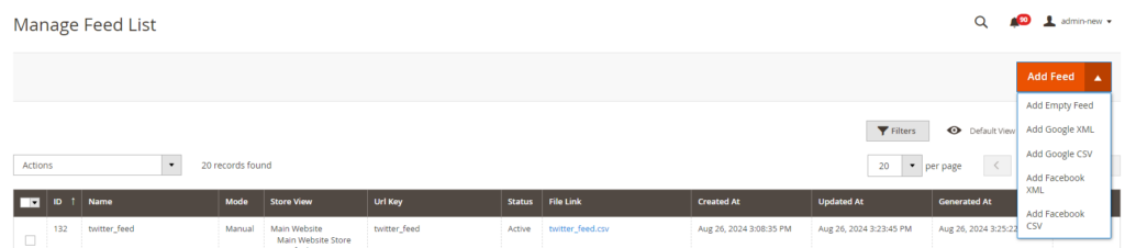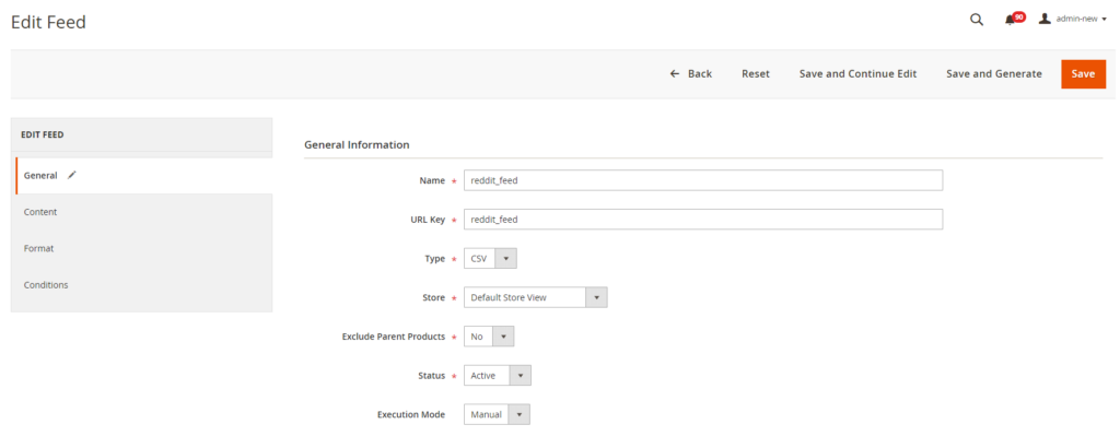 Once you have completed your new product feed set up, click on save and generate to manually generate the feed. We can also do it from the Feed list grid. Please note this will only work if the execution mode is set to “Manual”. If its set to automatic then feed will be automatically generated based on cron schedule.