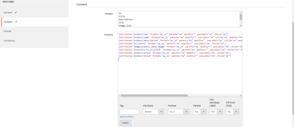 In the Content section, add the header, content and footer of the feed. You can use insert or update to add or change existing values.