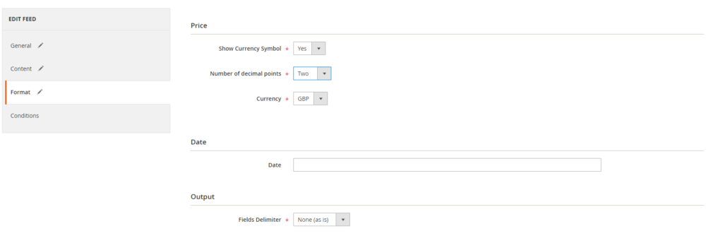 In the general section, add the name and URL key of your new feed, select the type CSV/XML/TXT, make sure the status is set to “Active” and select the execution mode from Manual/Automatic. When manual is selected we will have to manually generate the feed from the feed list grid else the feed gets automatically generated via cron.