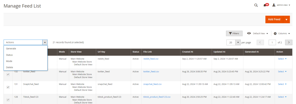 To generate the feed manually from grid you can select the feeds from the menu and then use the Actions dropdown to bulk generate multiple feeds together.