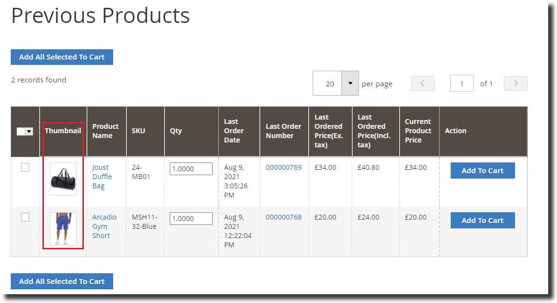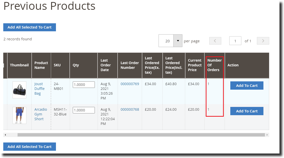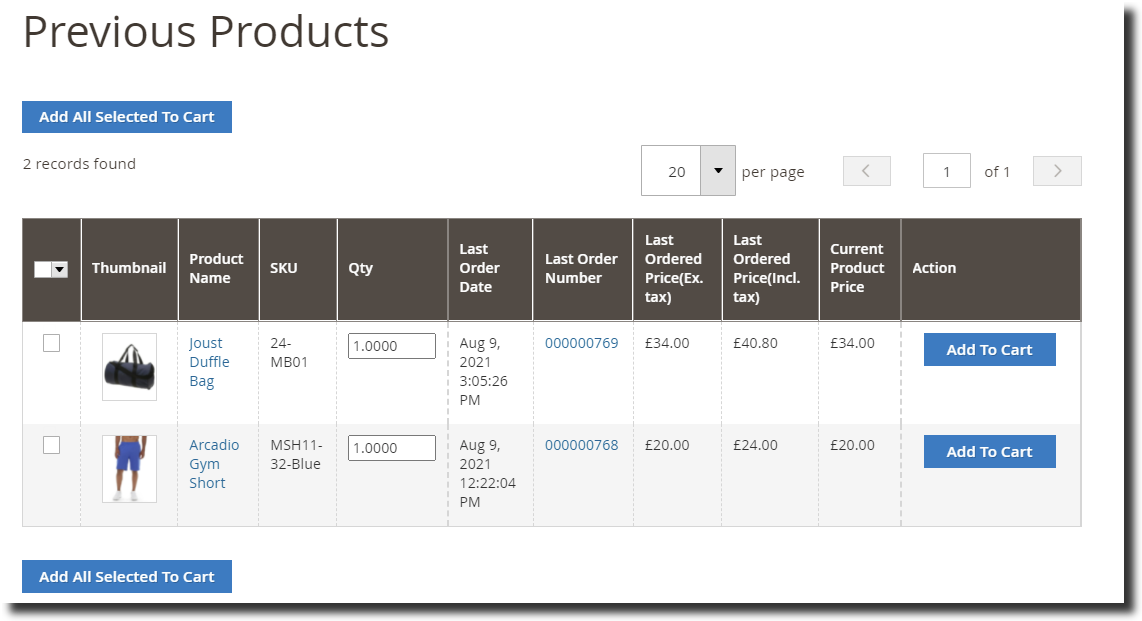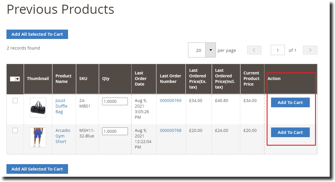 - Add to Cart:- Add to cart button alongside each product as well as on top and bottom of the grid to add multiple products to cart at once. This gives customers a seamless reorder functionality.