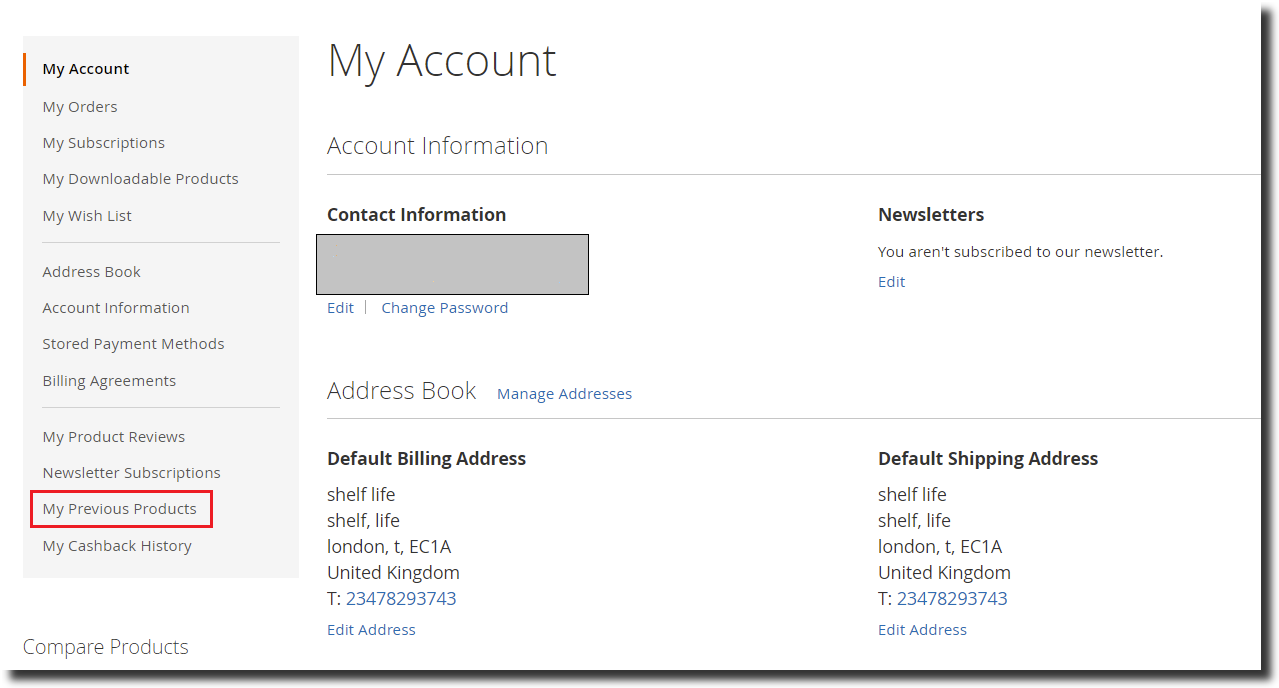 Step 5:- Login to your account on the frontend and navigate to the My Account section then from the left menu click on My Previous Products.