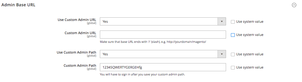 - Change Admin URL:- if your admin path is not secure navigate to Admin>Stores>Configuration>Advanced>Admin>Admin Base URL ans set “Use custom Admin URL” to “Yes” and then add in your custom Admin URL.