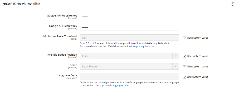- Enable Recaptcha:- Go to Admin>Stores>Configuration>Security>Google ReCaptcha Admin Panel/Google ReCaptcha Storefront>ReCaptcha V3 invisible and add in the Google Website Key and API secret Key. These keys can be obtained here.