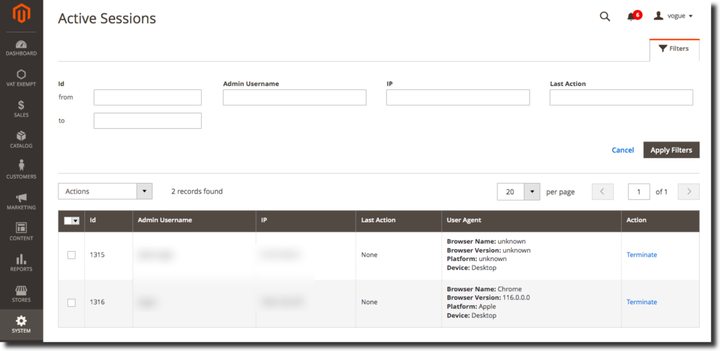 The Active Sessions Grid provides real-time visibility into the active sessions accessing your admin panel. By monitoring this grid, you can quickly detect any unauthorized or suspicious logins, allowing you to promptly take action to safeguard your store’s sensitive information. Additionally, the ability to view active sessions empowers administrators to identify and terminate any sessions that may pose a security risk.