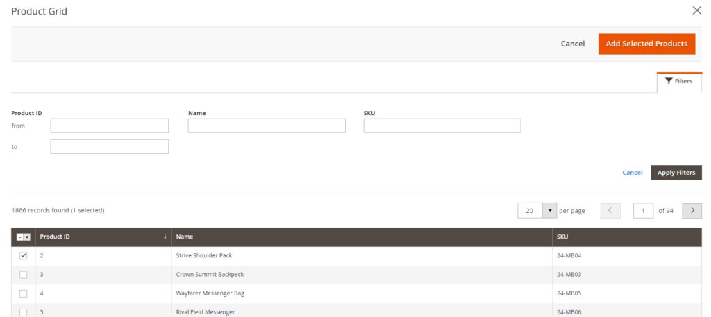 Step 3:- Select the product/products that you want to link with your primary product. You can also make use of available filters to find the products. Once selected click on “Add Selected Products”.