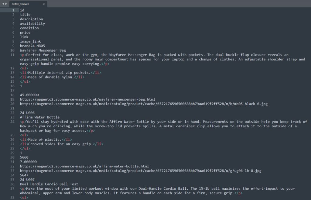 A product feed is essentially a structured file containing all the essential information about your products. This information is organized in a way that platforms like Twitter(X) can easily understand and use to display your products to potential customers. In addition to product information, a Twitter(X) Product Feed specifically contains details tailored for the platform, ensuring your products are presented effectively. Key data points typically included are: