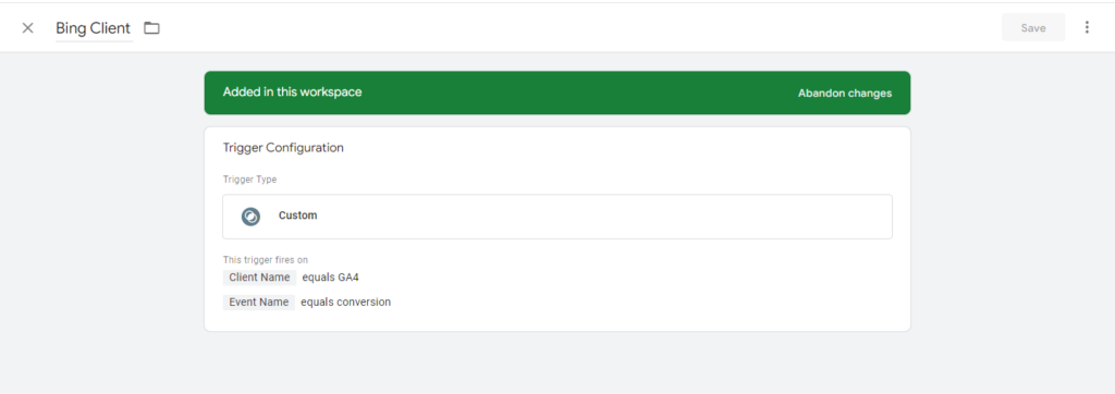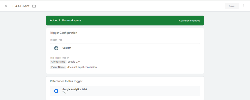 In your server container, go to triggers and modify the GA4 trigger to not fire upon our custom event so that this event doesn’t reach GA4(We do not want to send this custom event to GA4 but rather utilize the data from this event to be sent to Microsoft).