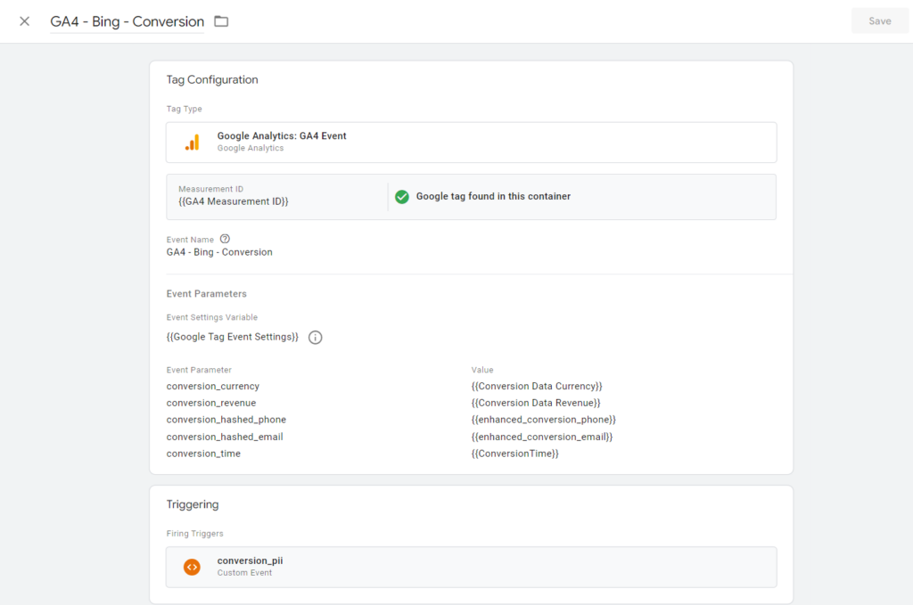 - Trigger:- Set up the custom event trigger where all this data is available, for eg:- if you are collecting hashed phone email etc. at purchase then set up the purchase trigger, in our case we push it in a separate event “conversion_pii”