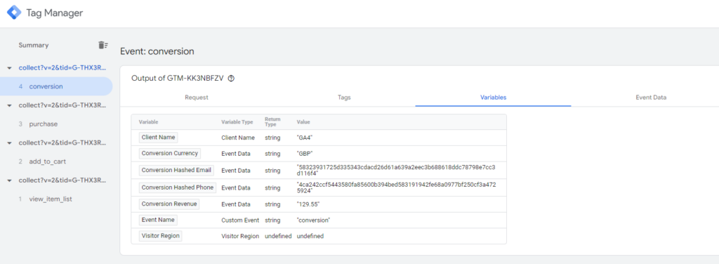- You should see your event in both the containers as well as you can verify the event variables and data to make sure correct fields are getting sent to the Microsoft Ads.
