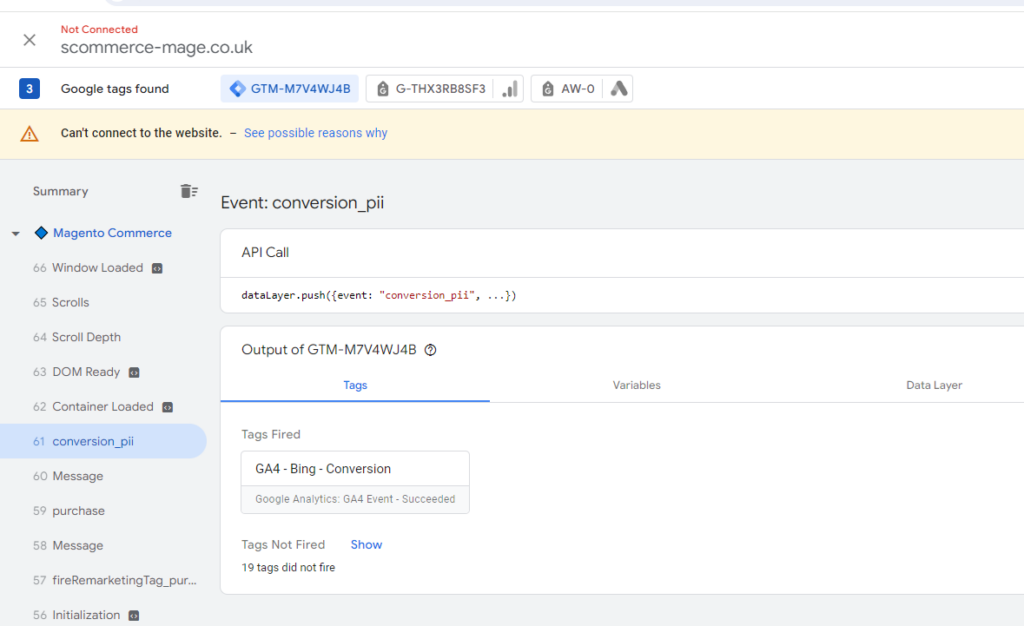 - GA4 data layers should be implemented on your store as well as GTM, make sure you are also collecting PII data, if not you can use our module which implements the necessary data layers on your Magento store.