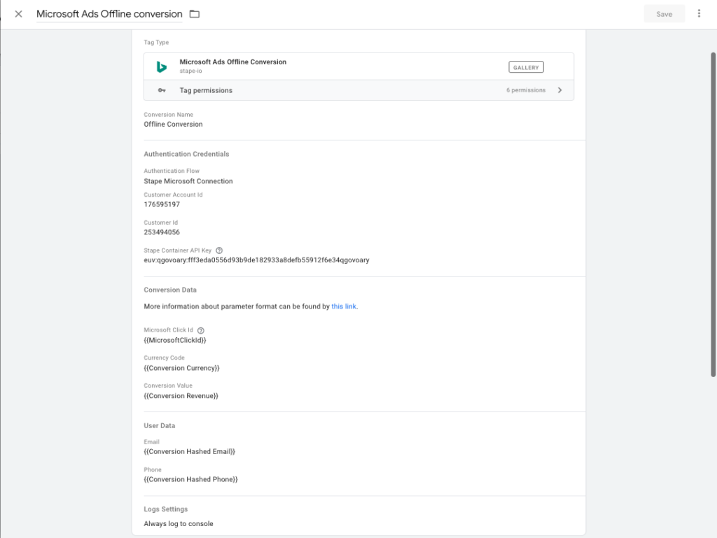 Create the Microsoft Ads Offline Conversion Tag with the following settings:-