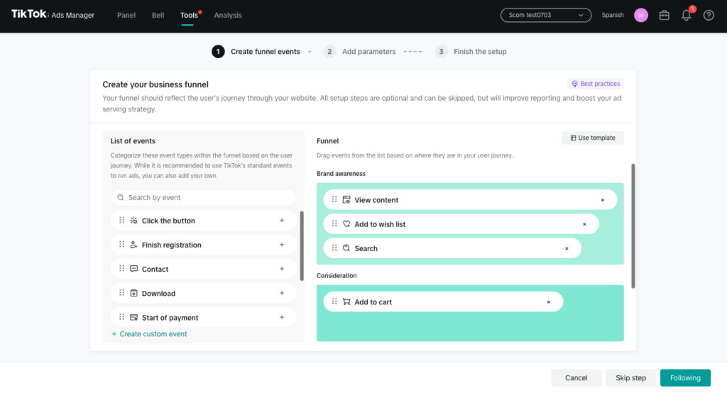- Accessing TikTok Ads Manager: Log in to your TikTok Ads Manager account. Click on “tools” from the top menu then click on “Events”. Finally click on “Manage” under “Web Events”.