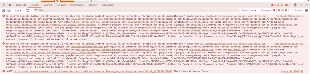 This error related to Content Security Policy is visible on the store when any inline scripts or styles are present on the store. We are required to use “Hash” type whitelist for these inline scripts/styles to fix them.