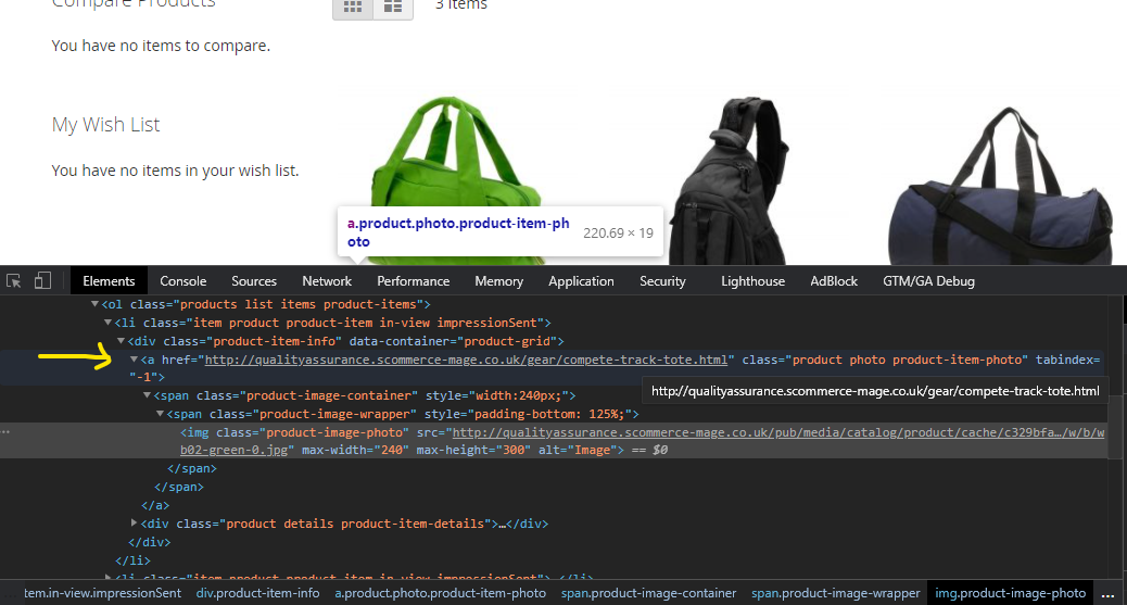Step 5:- You should see the unique URL for the product on your frontend no matter where you open the product. For instance, first, we open this product by going into Gear>Bags and then clicking on the product. Second, we directly search for the product using SKU. As you can see in the image below both the pages have the same URL.