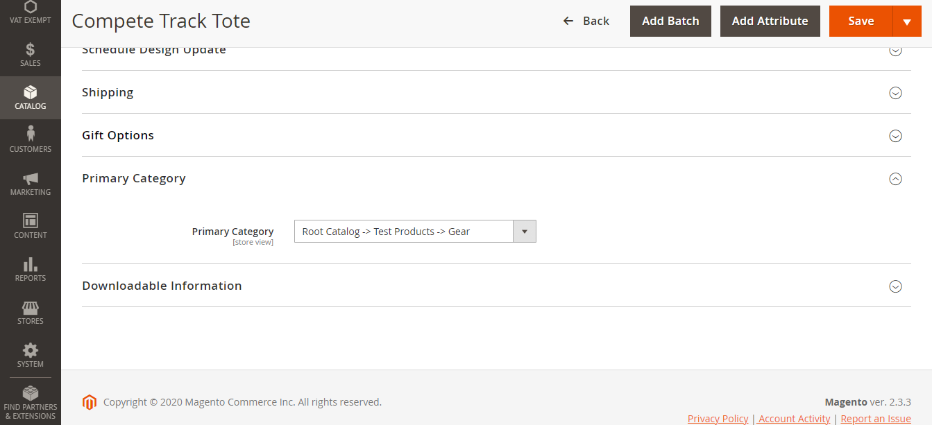 Step 4:- Scroll down on the product settings page until you find Primary Category. In the dropdown select the primary category that you want to be in your unique URL. In this case, we have Gear. Once done click on Save.