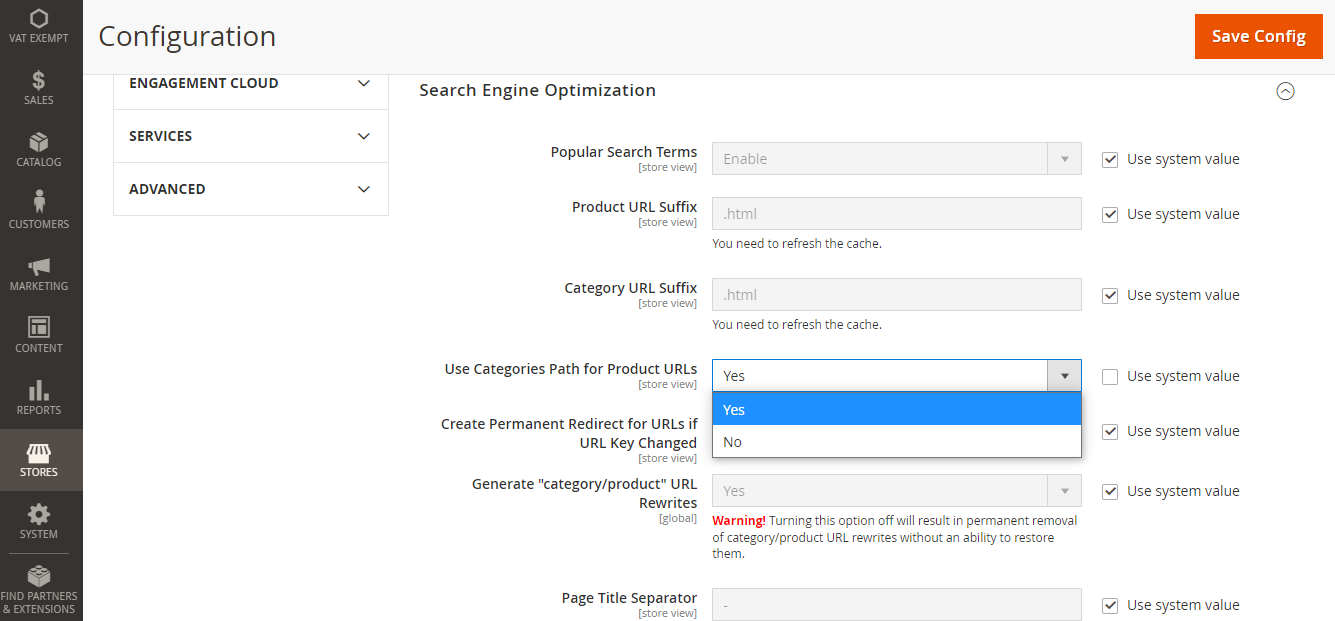 Step 2:- Log in to your admin panel and go to Stores>Configuration>Scommerce Configuration> Catalog URL. Enable the extension and exclude any categories that you want. Remember to clean the cache after saving the configuration.